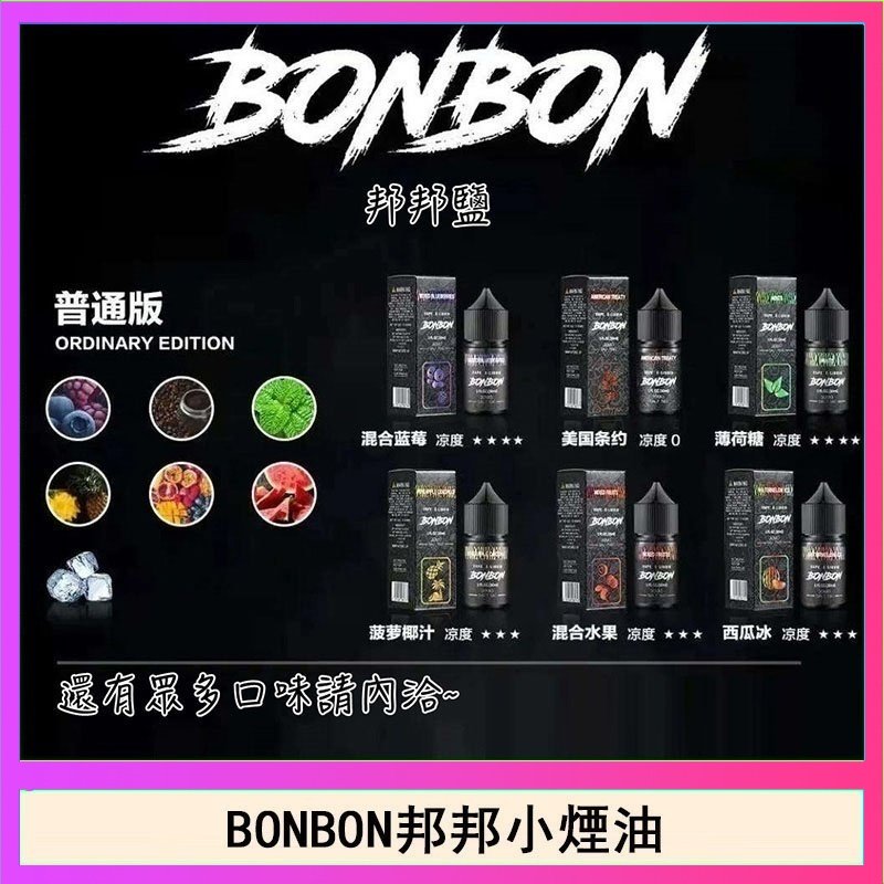 口味: 西柚 红冰 山楂 混合水果 惡魔之吻 薄荷糖 菠萝椰汁 西瓜冰 莓果廚師 混合蓝莓 法式檸檬派 今夜無飲 小芒芒 七星菸草薄荷 黑牌煙草 王牌煙草 曲奇煙草 黑標五木煙草 小綠人